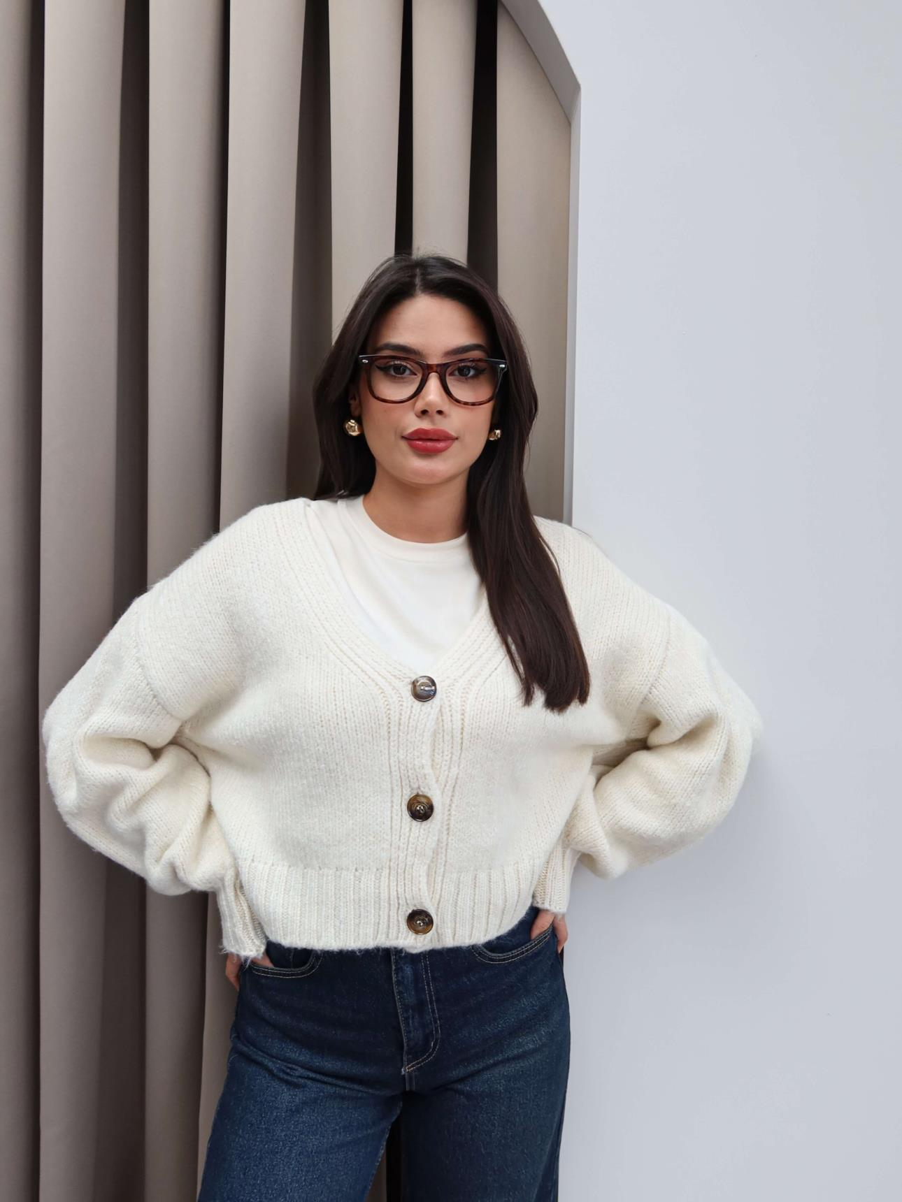 V Yaka Düğmeli Hırka (EH-6055-KREM)