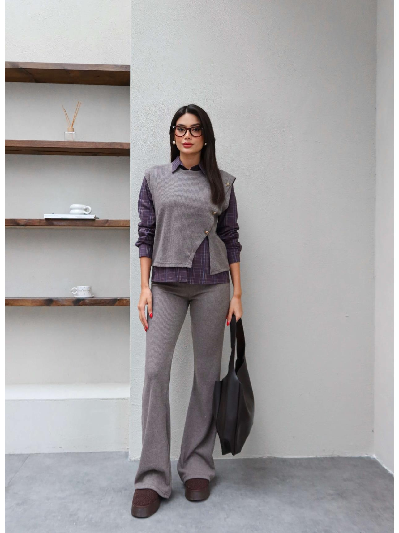 Asimetrik Düğme Görünüm Triko Üçlü Takım