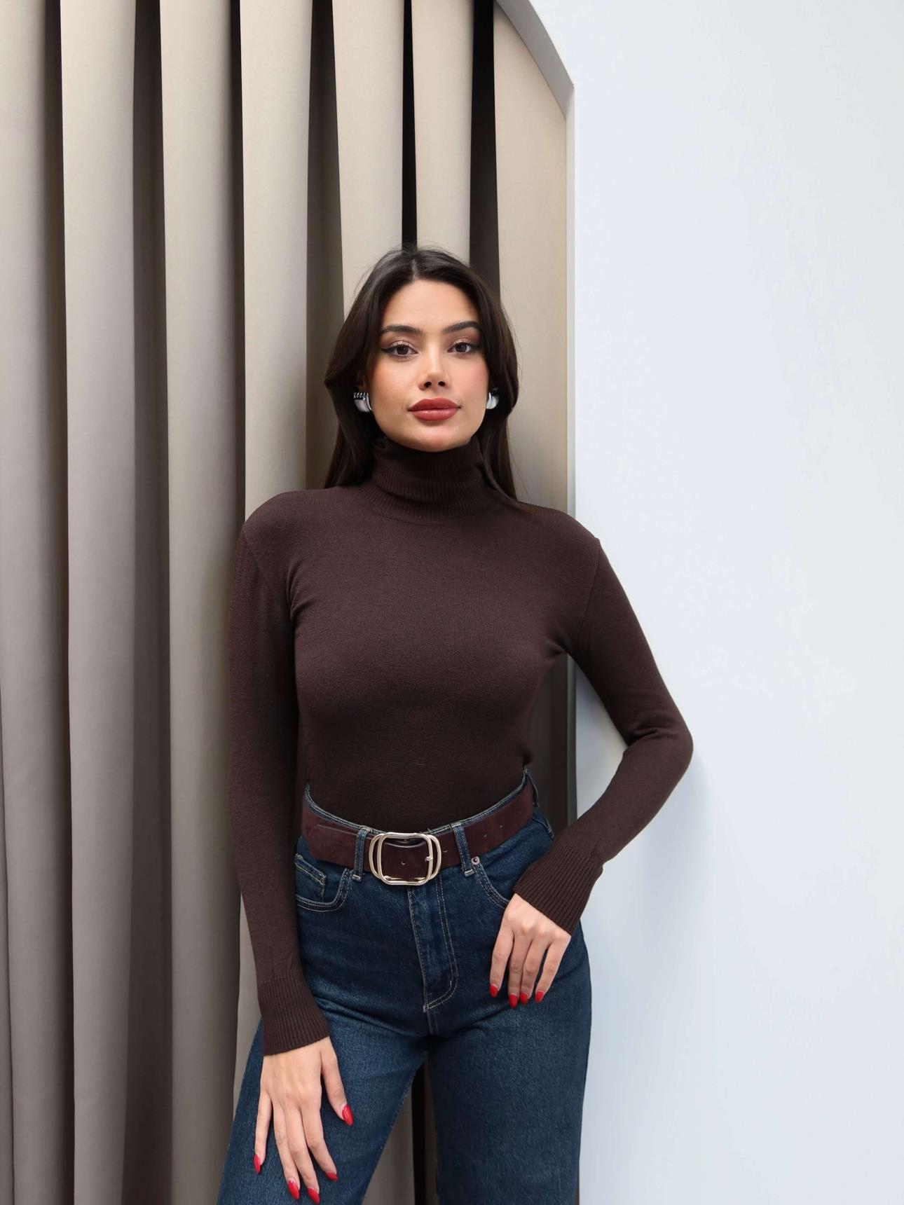 Balıkçı Yaka Düz Kazak (EH-6063-ACIKAHVE)