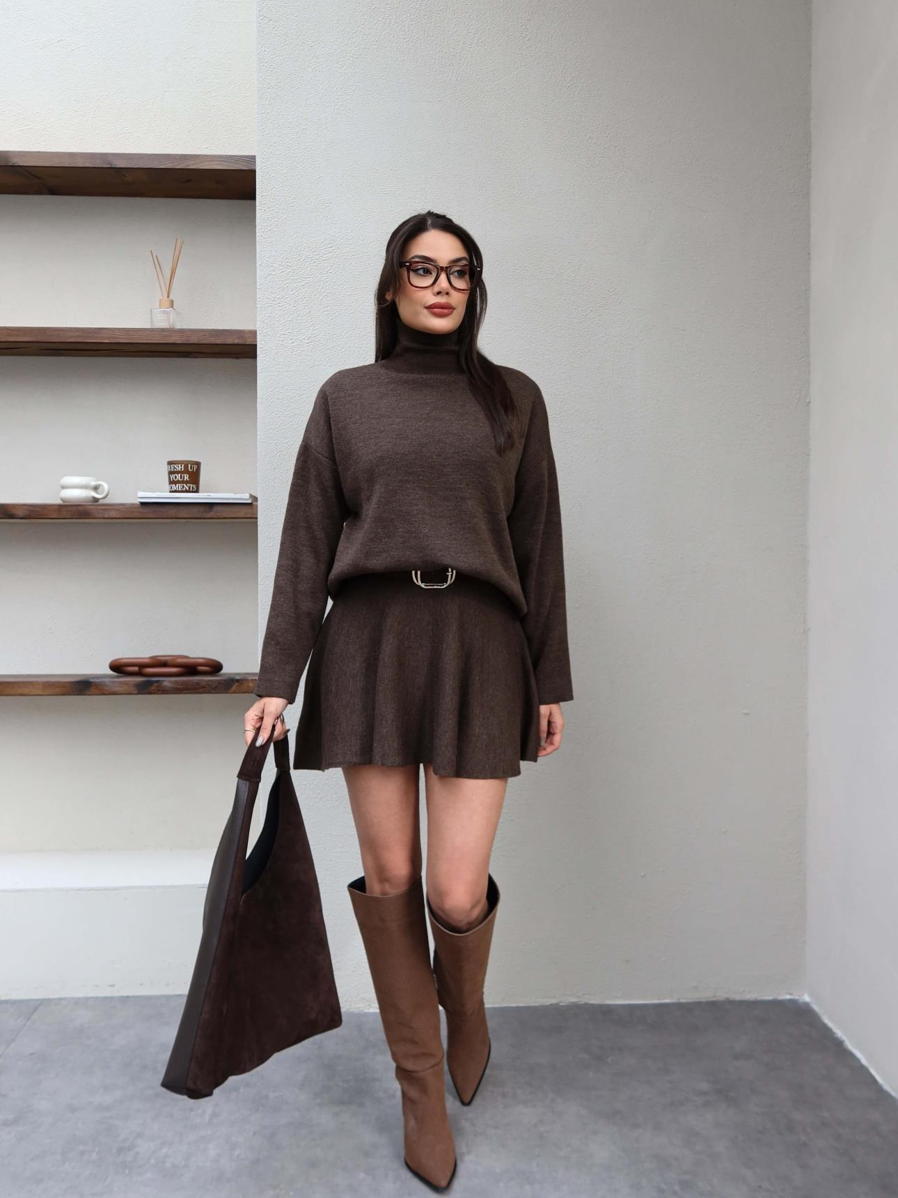 Balıkçı Yaka Triko Etekli Takım (EH-6125-KAHVE)