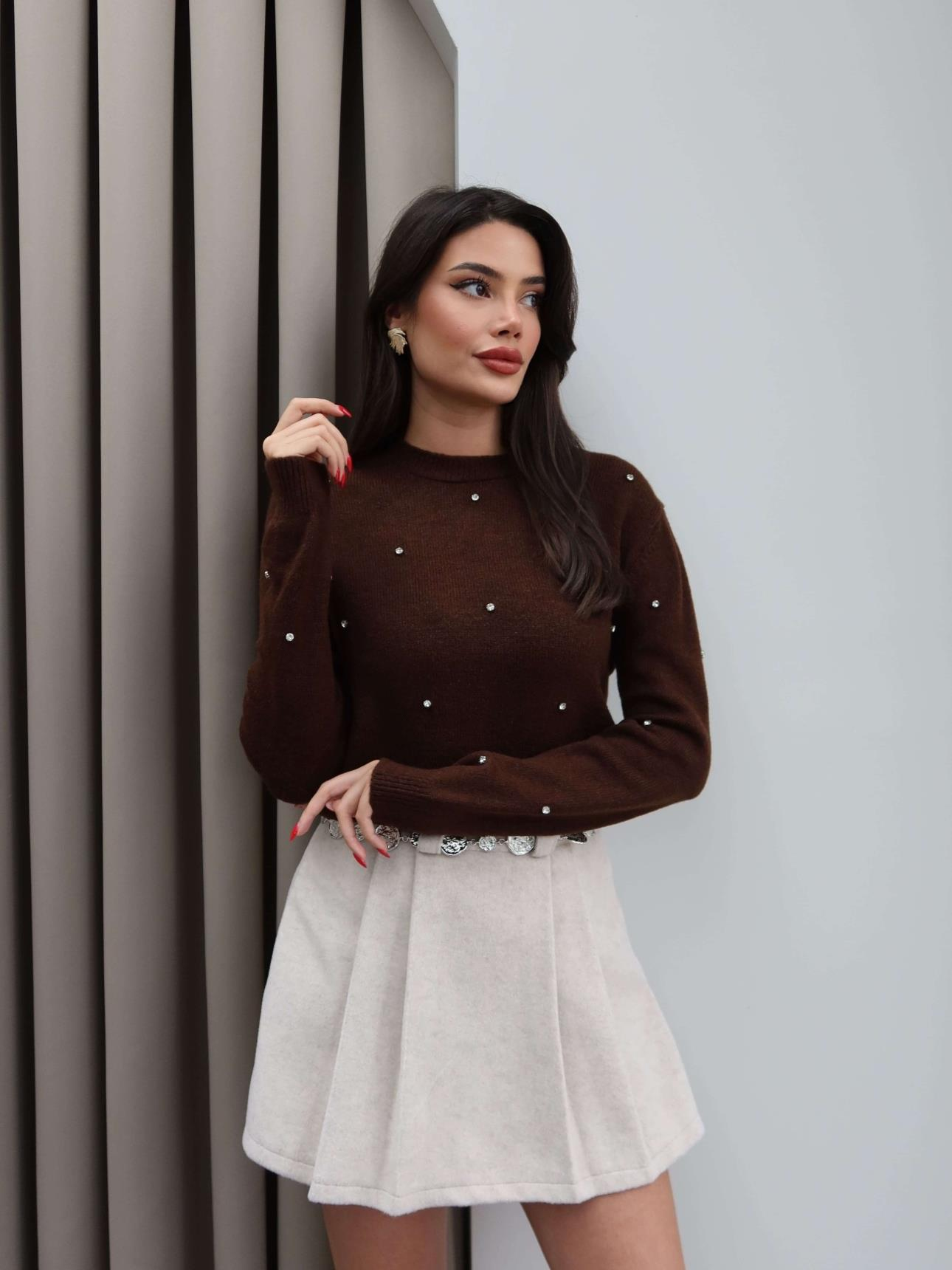 Bisiklet Yaka Taşlı Triko Kazak (EH-6062-KAHVE)