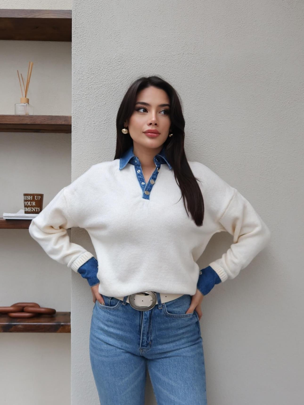 Çıtçıtlı Denim Detay Triko Kazak (EH-6085-KREM)