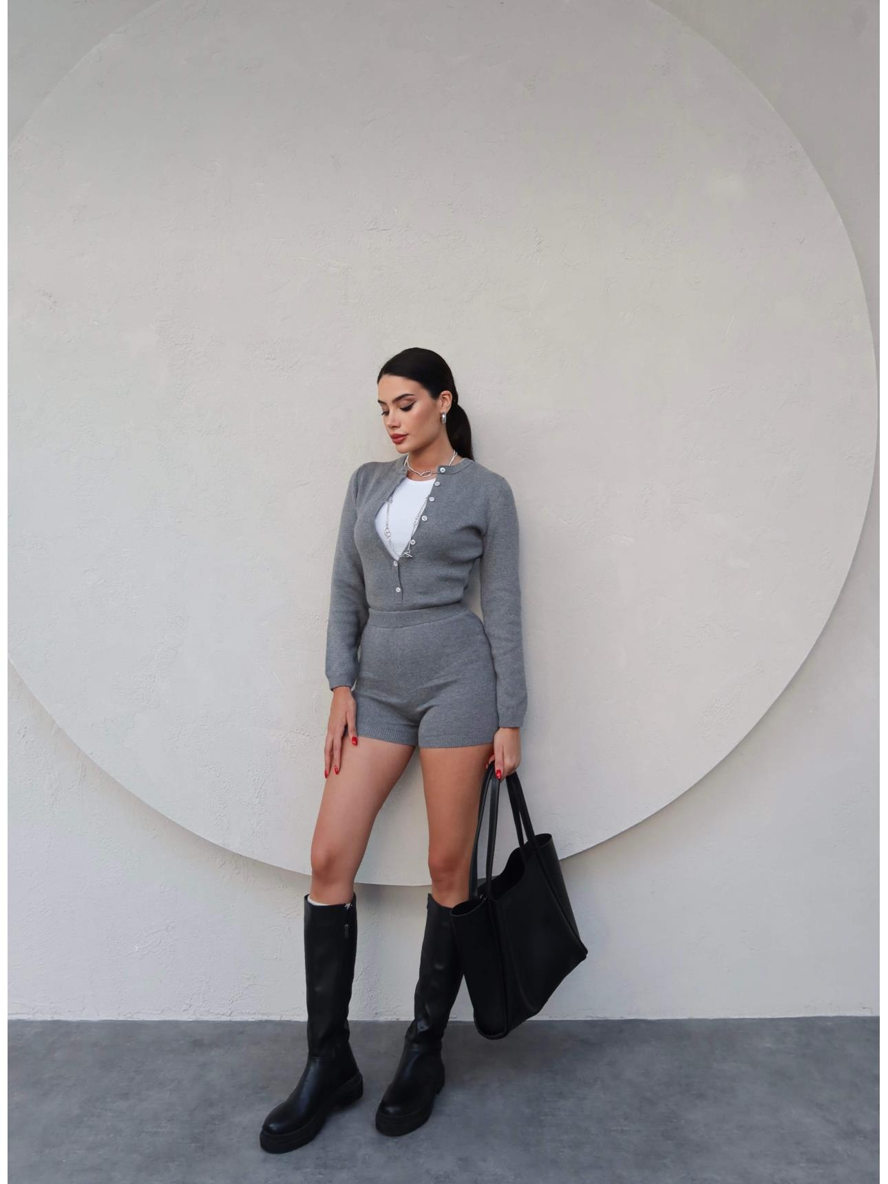Düğmeli Triko Bodysuit Takım (EH-5928-GRİ)