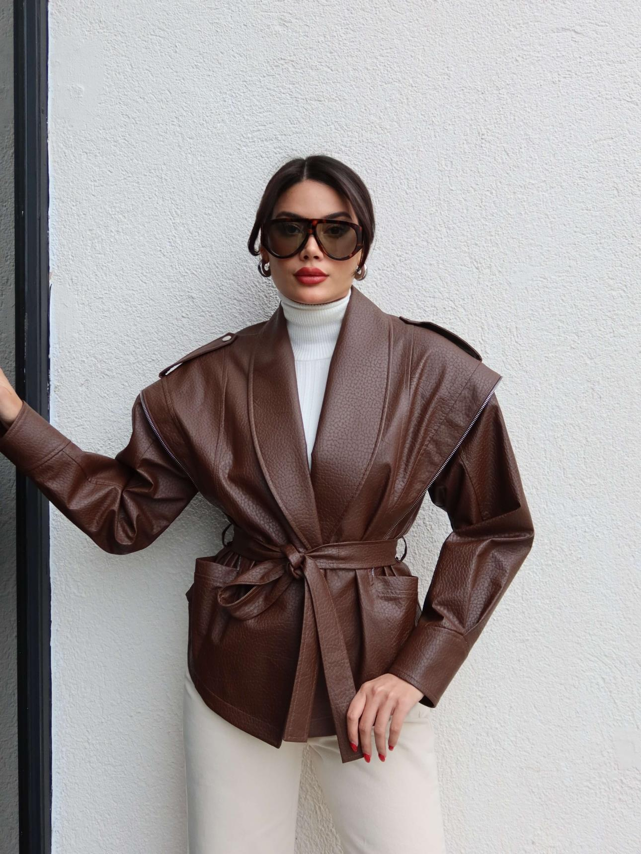 Fermuar Detay Kuşaklı Deri Ceket (EH-6065-KAHVE)