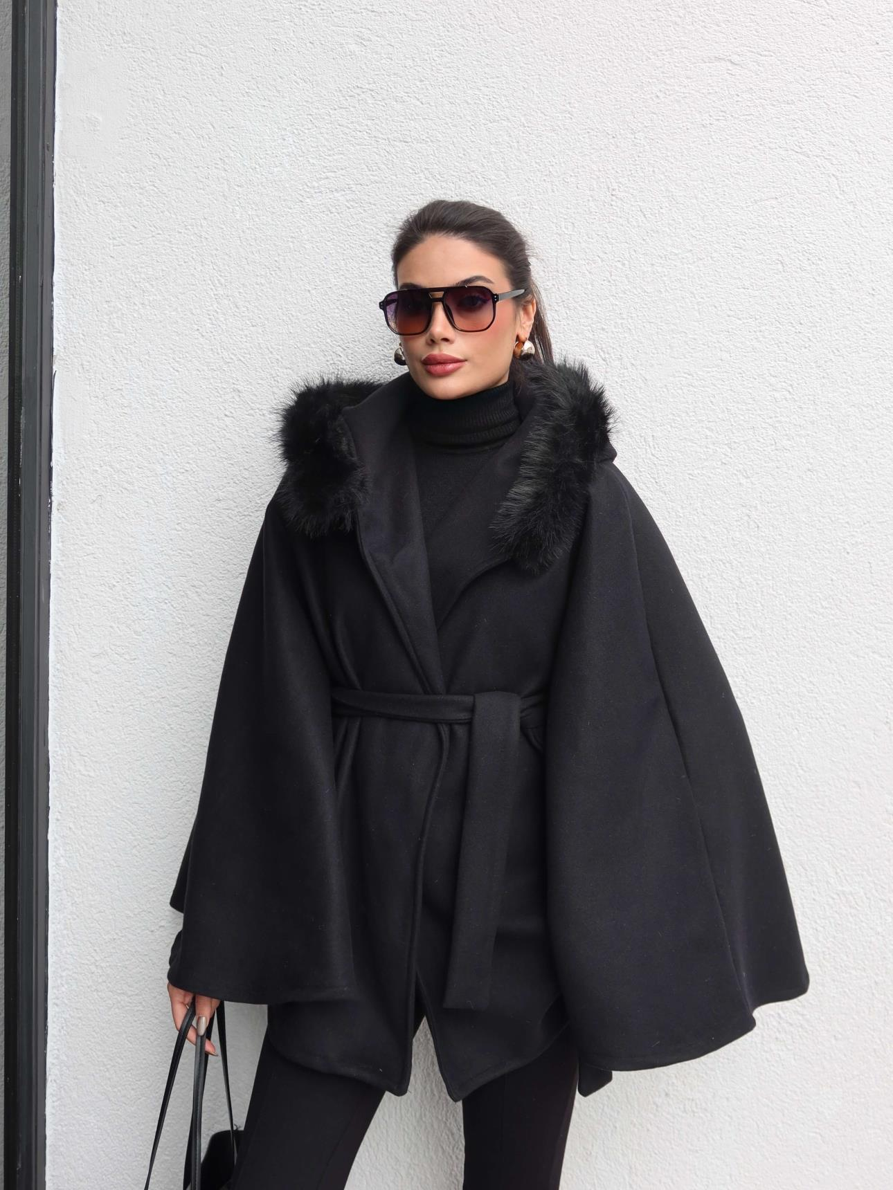 Kürk Kapüşonlu Panço (EH-6113-SİYAH)