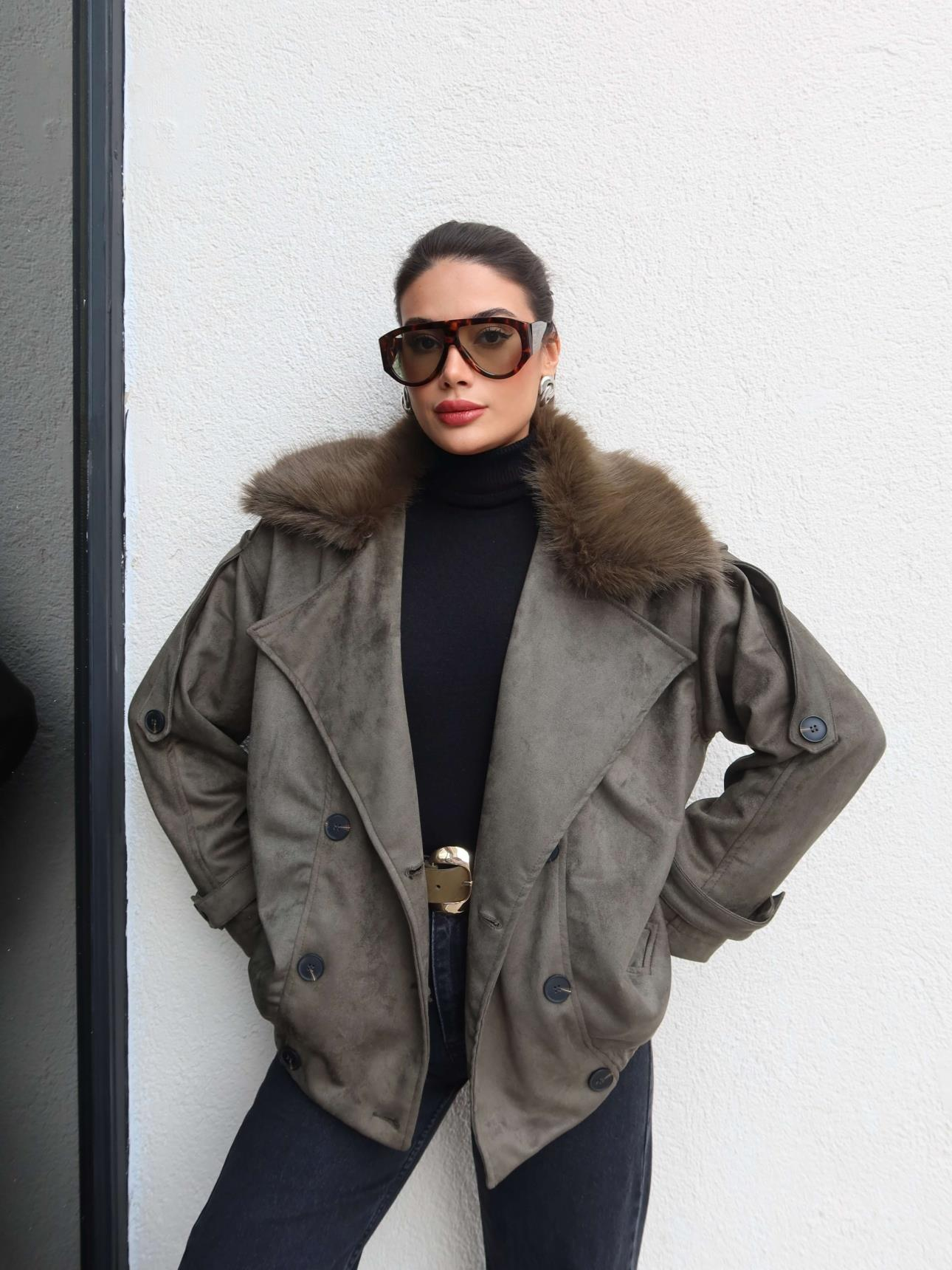 Kürk Yaka Bel Lastik Süet Ceket (EH-6117-HAKİ)