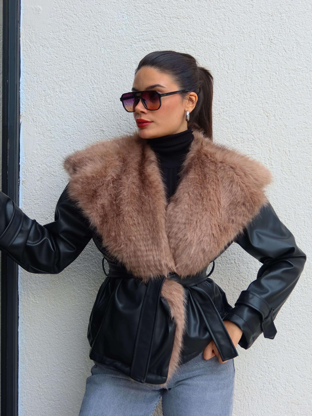 Kürk Yaka Kuşaklı Deri Ceket