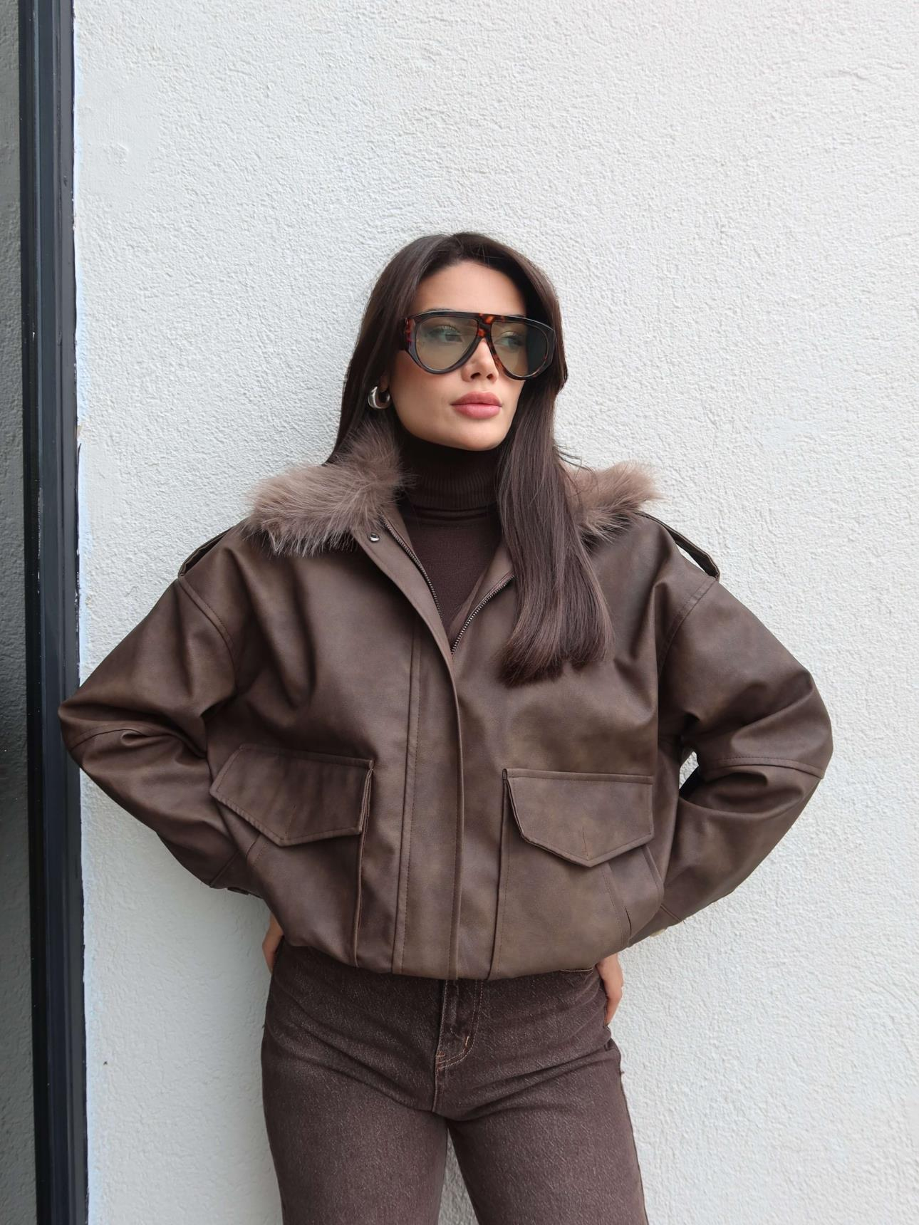 Kürk Yaka Suni Deri Ceket (EH-6078-ACIKAHVE)