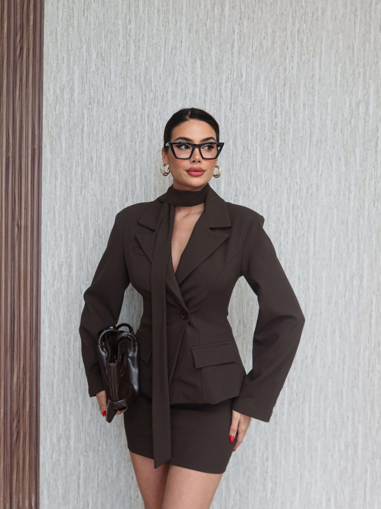 Kuşaklı Kruvaze Yaka Etekli Ceket Takım (EH-6072-ACIKAHVE)