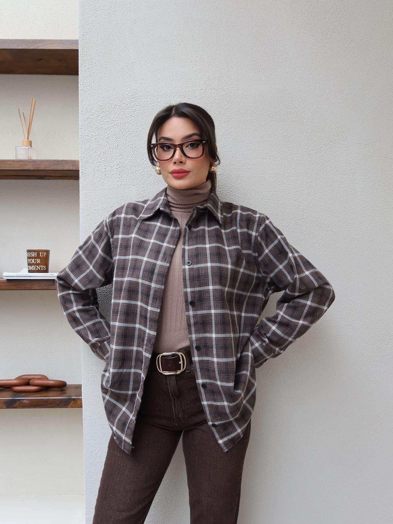 Oversize Ekose Gömlek (EH-6045-COFFEE)