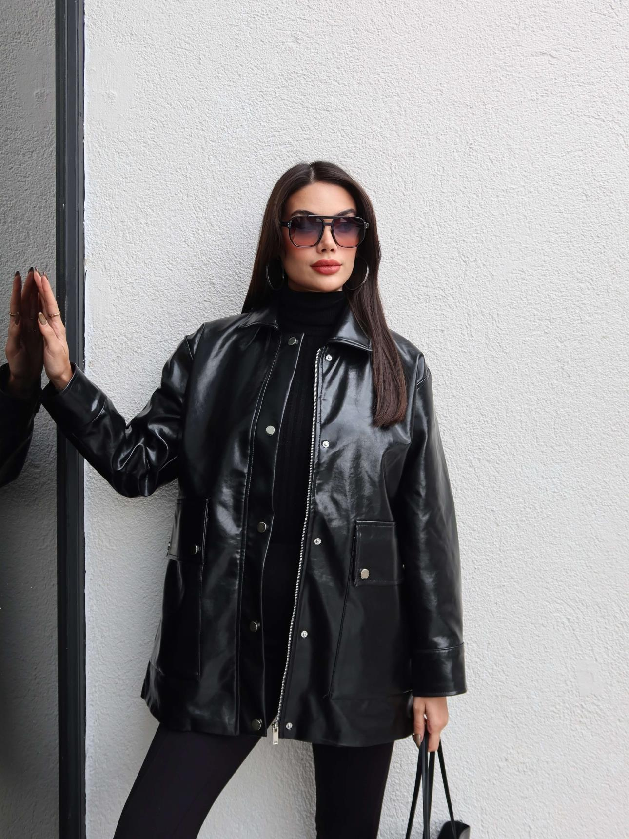 Parlak Çıtçıtlı Deri Ceket (EH-6146-SİYAH)