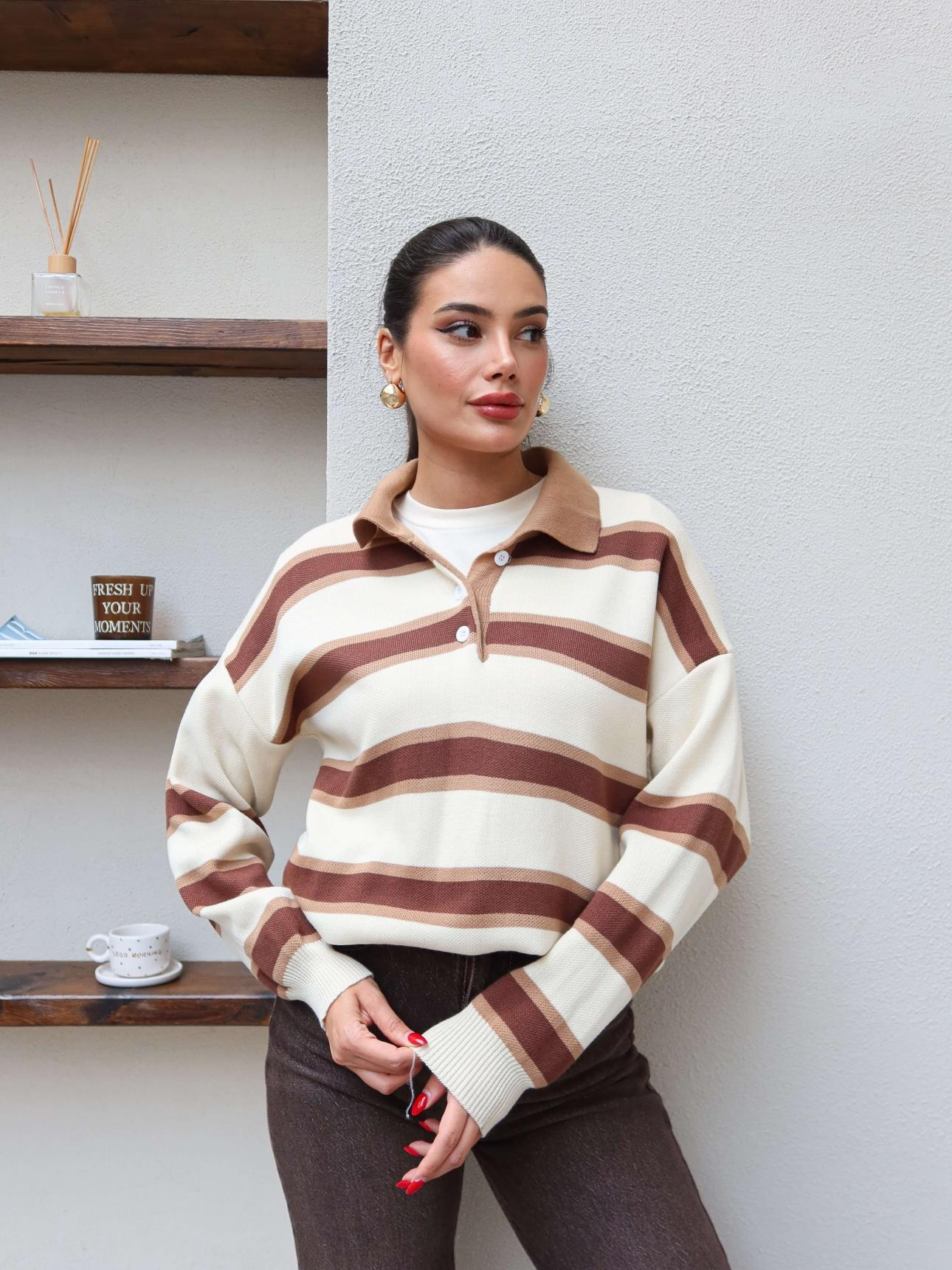 Polo Yaka Şeritli Triko Kazak (EH-6035-EKRU)