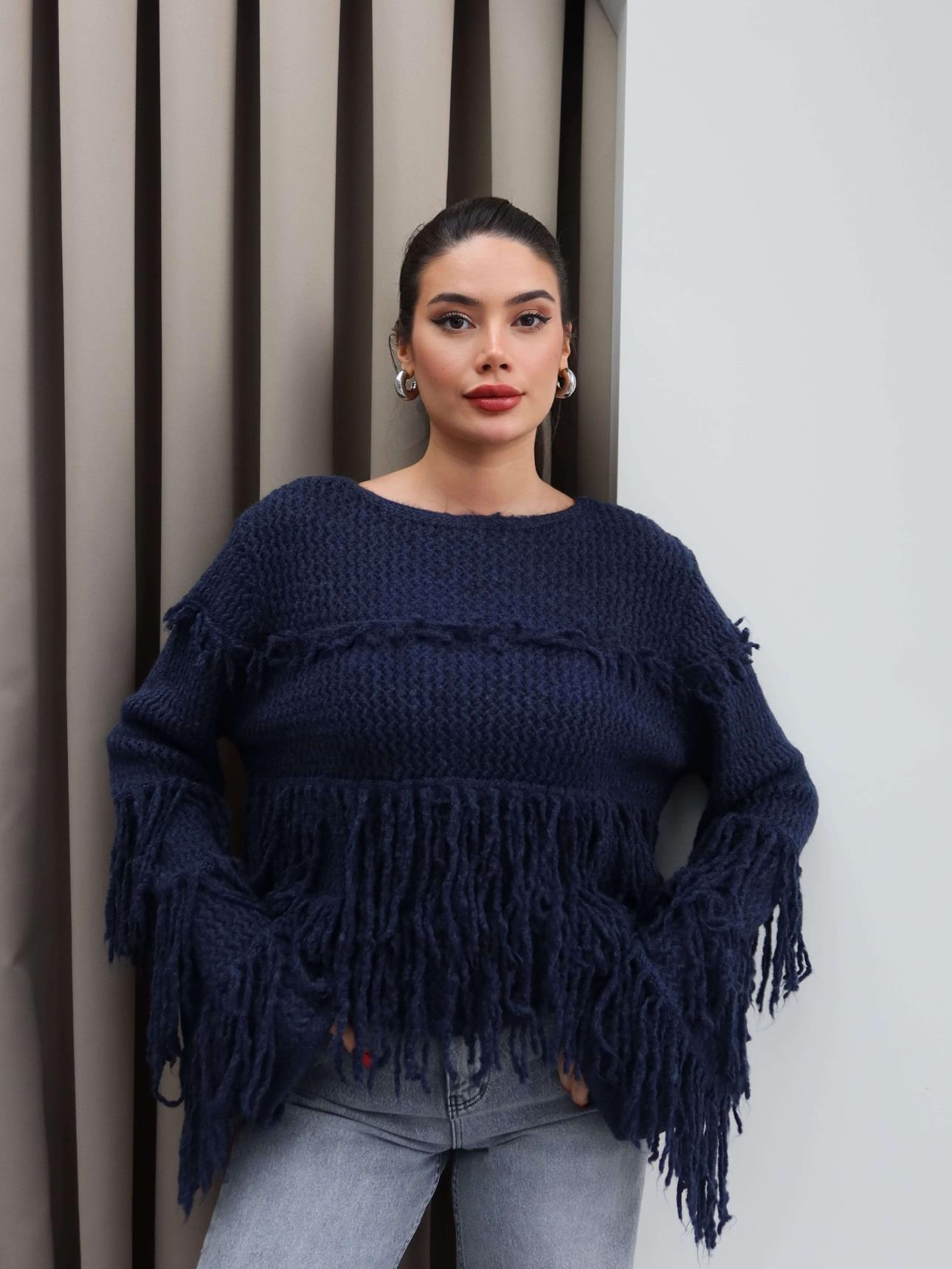 Saçaklı Salaş Örme Triko Kazak (EH-6077-LACİVERT)