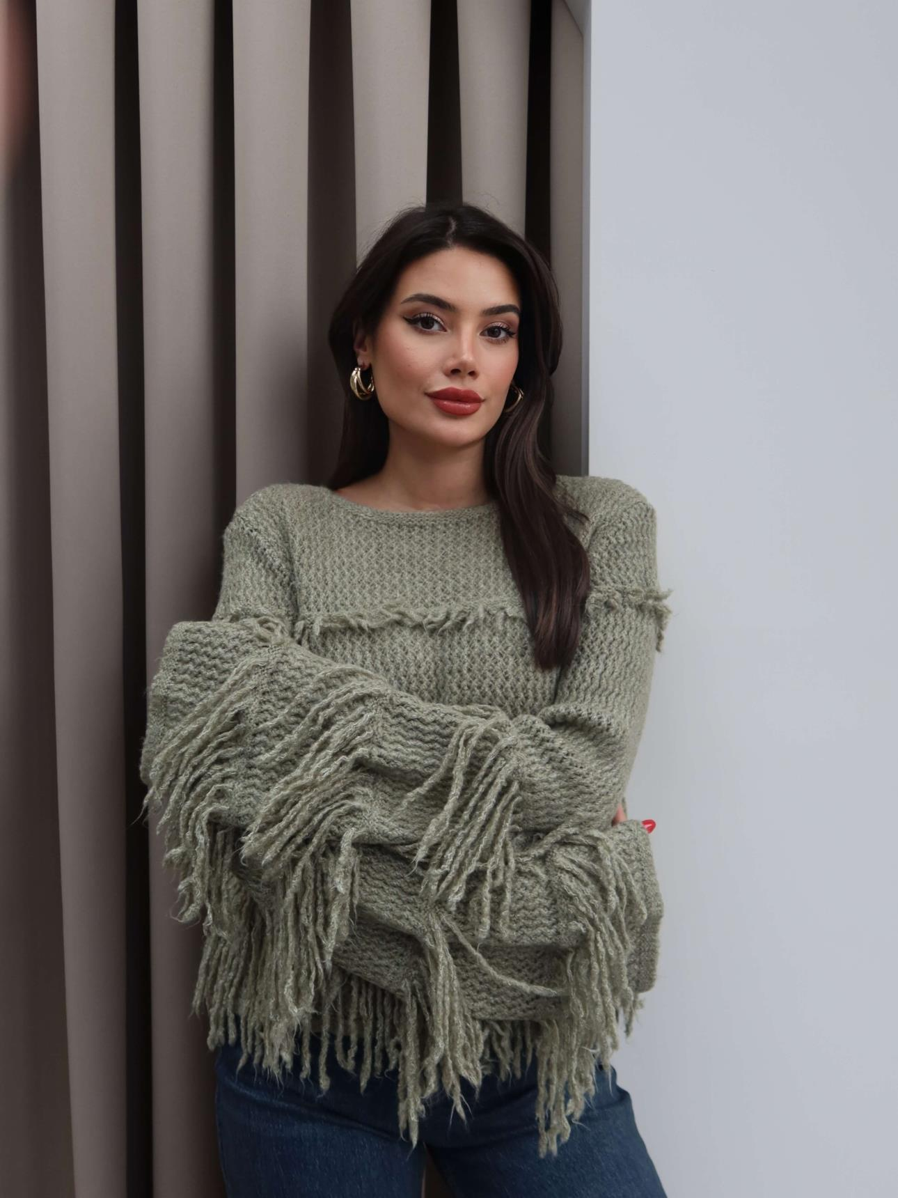 Saçaklı Salaş Örme Triko Kazak (EH-6077-HAKİ)