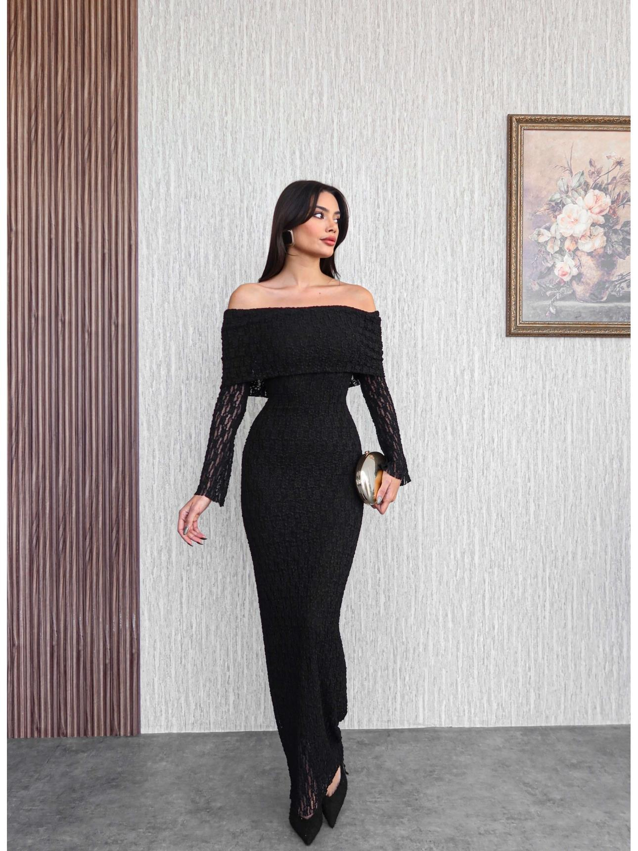 Açık Omuz Güpür Desenli Uzun Elbise (EH-6147-SİYAH)