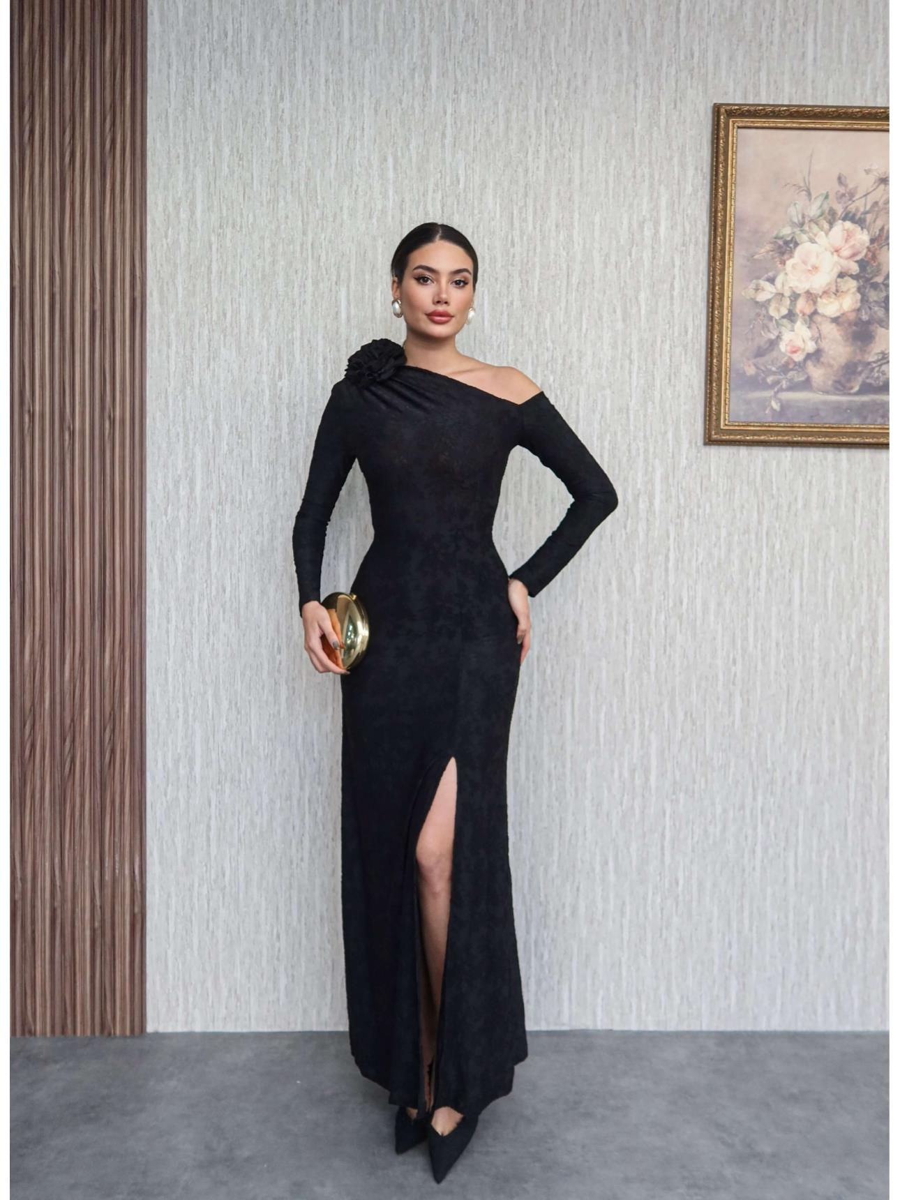 Tek Omuz Çiçek Aksesuarlı Elbise (EH-6126-SİYAH)