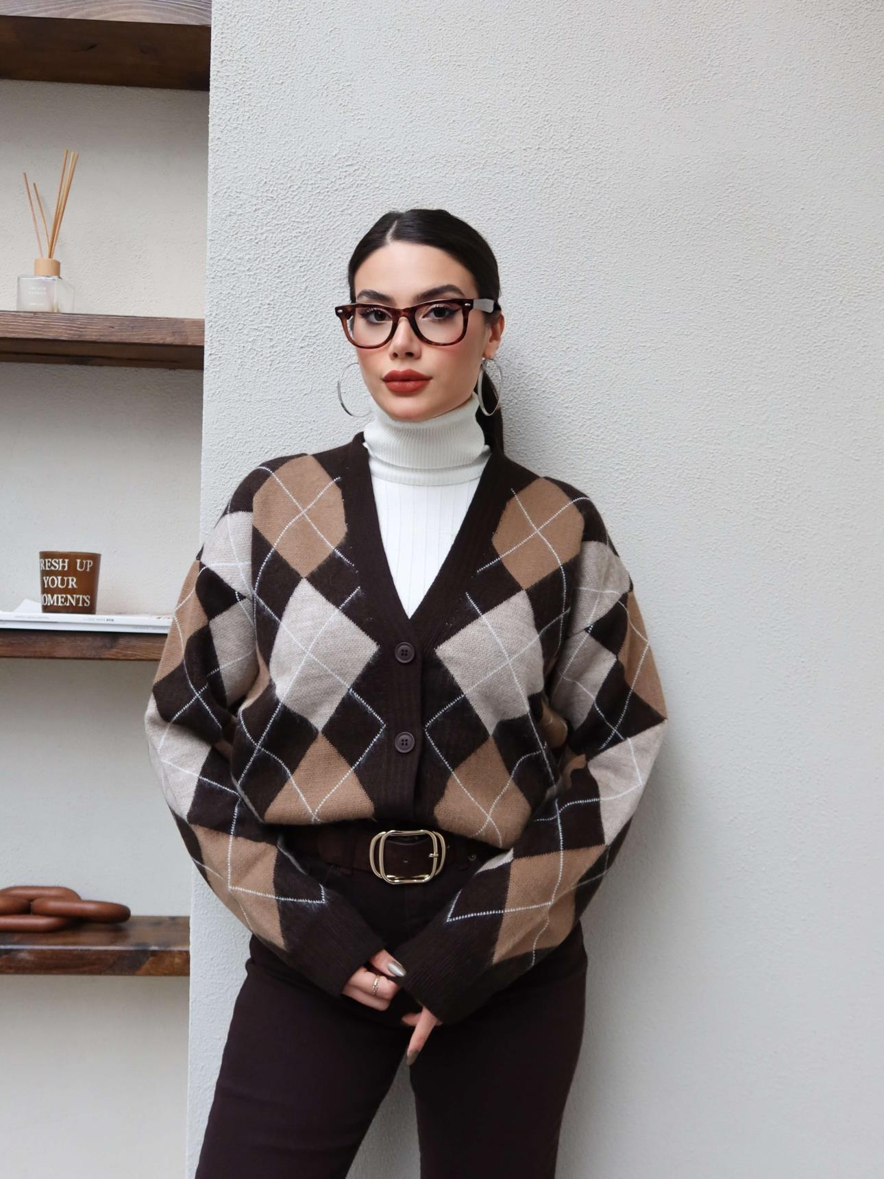 V Yaka Baklava Desenli Salaş Hırka (EH-6144-KAHVE)
