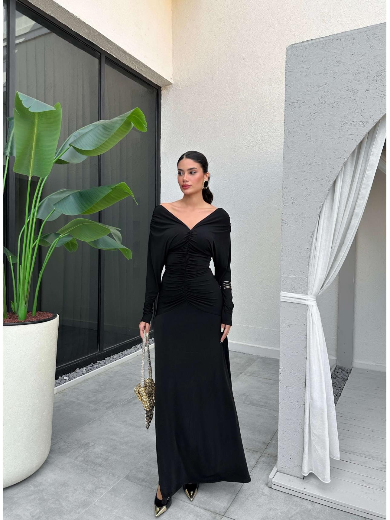 V Yaka Büzgülü Maxi Elbise (EH-5894-SİYAH)