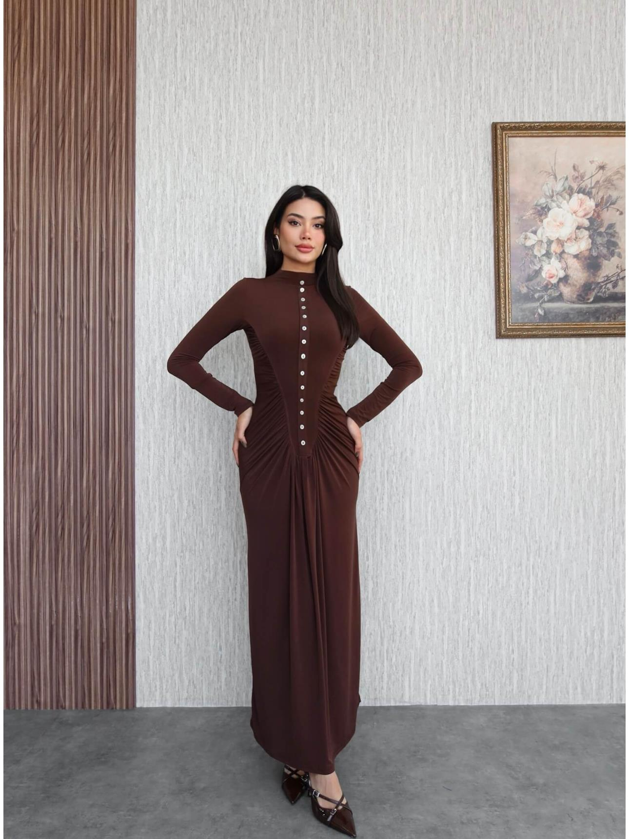 Yan Büzgü Düğme Detaylı Uzun Kol Elbise (EH-6099-KAHVE)